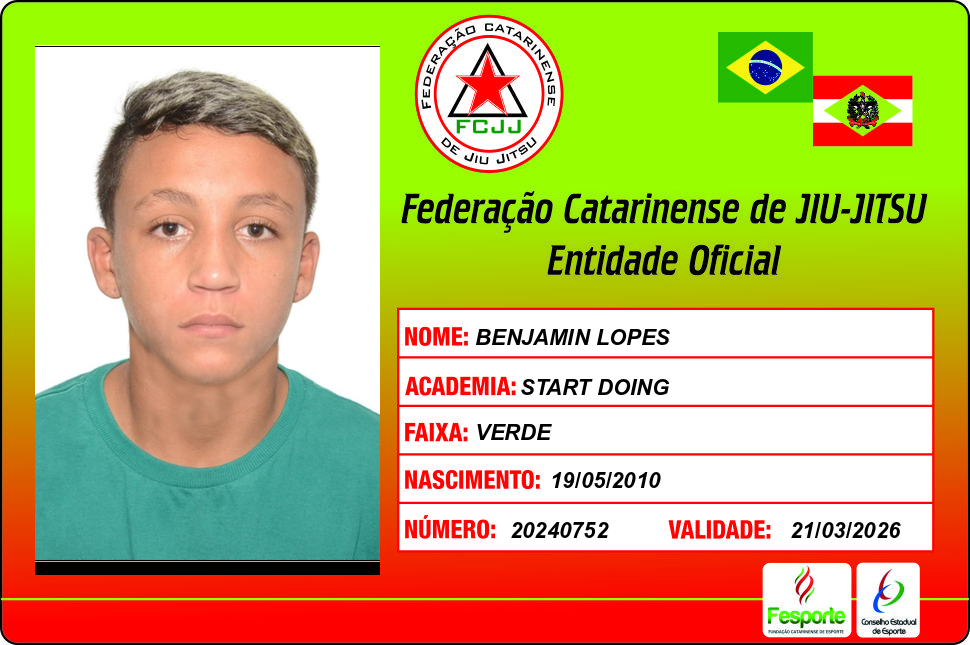 | 12/04/2025 | P2293-CAMPEONATO ESTADUAL DE JIU-JITSU FCJJ 2025 1 - ETAPA | BRASIL | SAO JOSE - SC | 1º | MASCULINO/INFANTO-JUVENIL/VERDE/PESADO | |