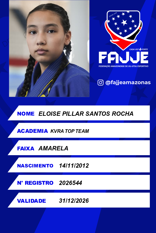 | 14/03/2026 | P2623-CAMPEONATO AMAZONENSE DE JIU-JITSU PRO 2026 - EDICAO | BRASIL | MANAUS - AM | 2º | FEMININO/INF-JUV B/AMARELA+LARANJA+VERDE/MEIO-PESADO |