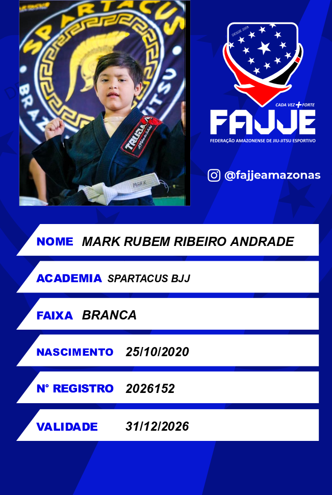 | 15/11/2025 | P2491-COPA CIDADE DA LUTA GI E NO-GI DE JIU JITSU ESPORTIVO - FAJJE 2025 - EDICAO | BRASIL | MANAUS - AM | 1º | MASCULINO/PRE-MIRIM/BRANCA/MEDIO |