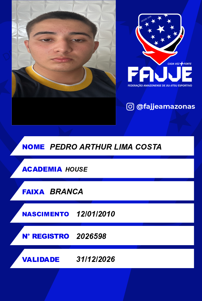 | 15/11/2025 | P2491-COPA CIDADE DA LUTA GI E NO-GI DE JIU JITSU ESPORTIVO - FAJJE 2025 - EDICAO | BRASIL | MANAUS - AM | 3º | MASCULINO/INF-JUV B/BRANCA/EXTRA-PESADISSIMO |