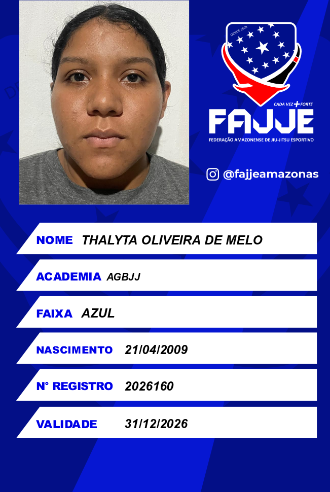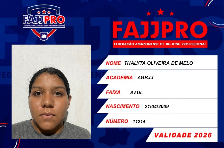 | 01/02/2026 | P2584-TACA AMAZONAS DE JIU-JITSU PRO 2026 - EDICAO | BRASIL | MANAUS - AM | 2º | FEMININO/JUVENIL/AZUL/PESADISSIMO |