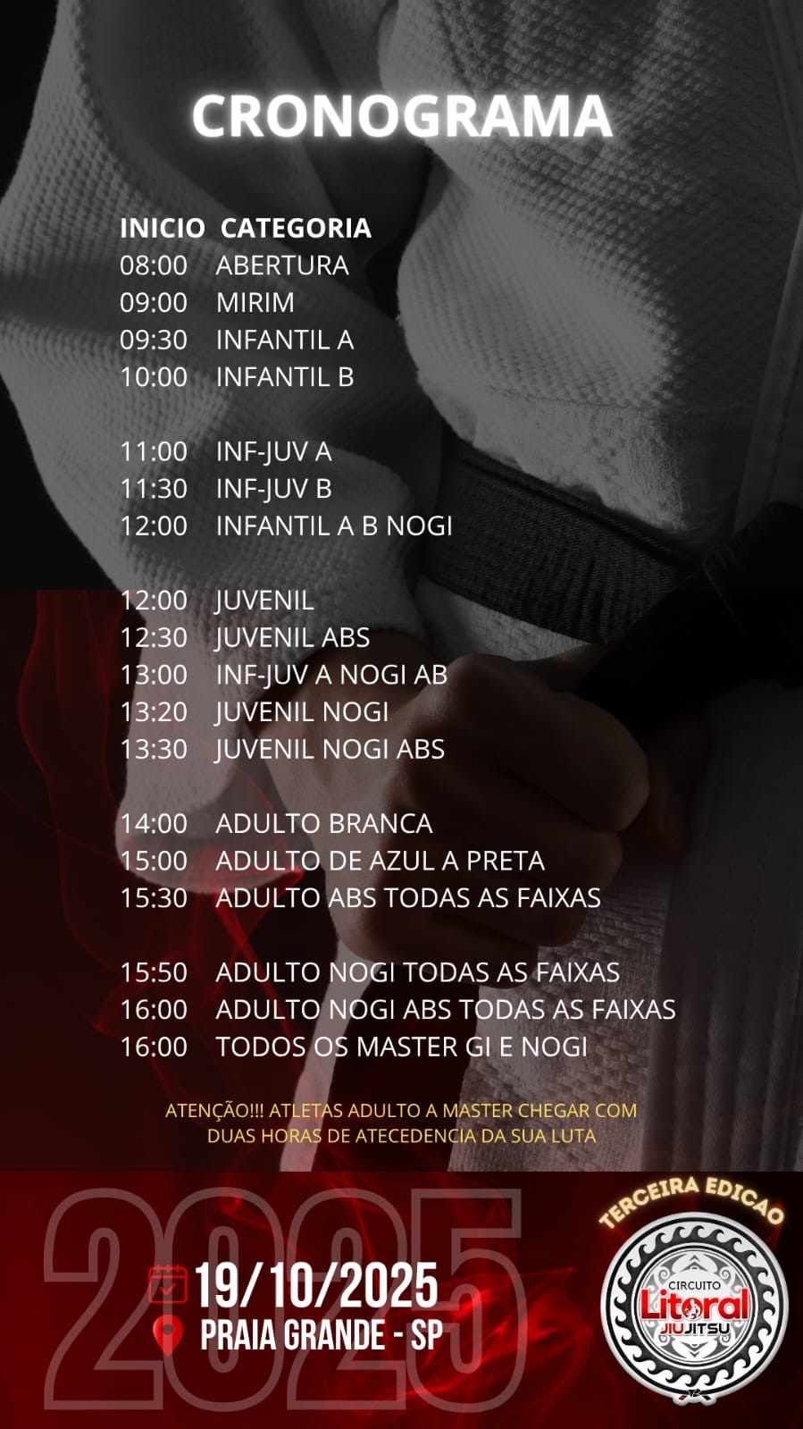 O atleta deve estar no local 1 hora antes da respectiva categoria, seguindo o cronograma de lutas.