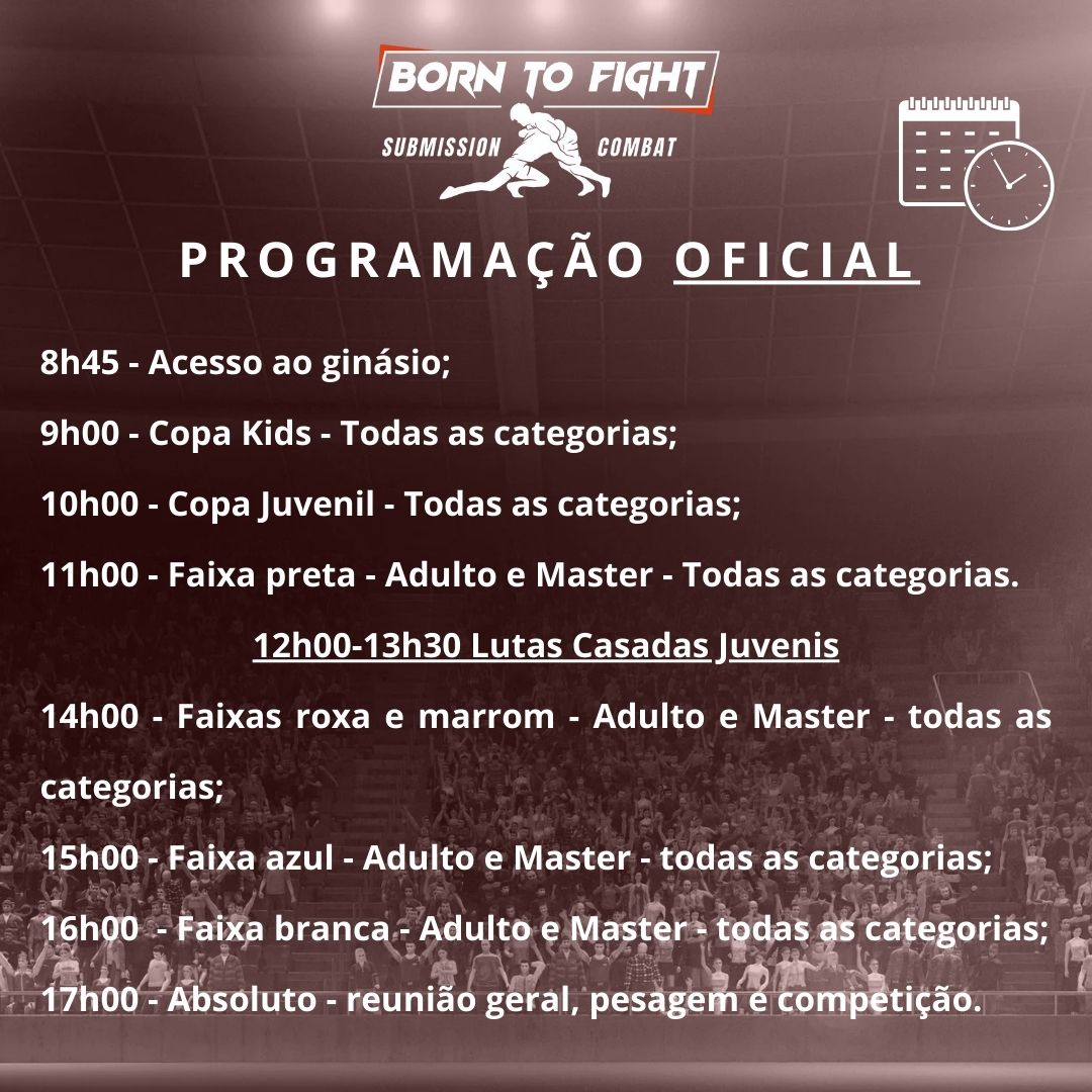 O atleta deve estar no local 1 hora antes da respectiva categoria, seguindo o cronograma de lutas.