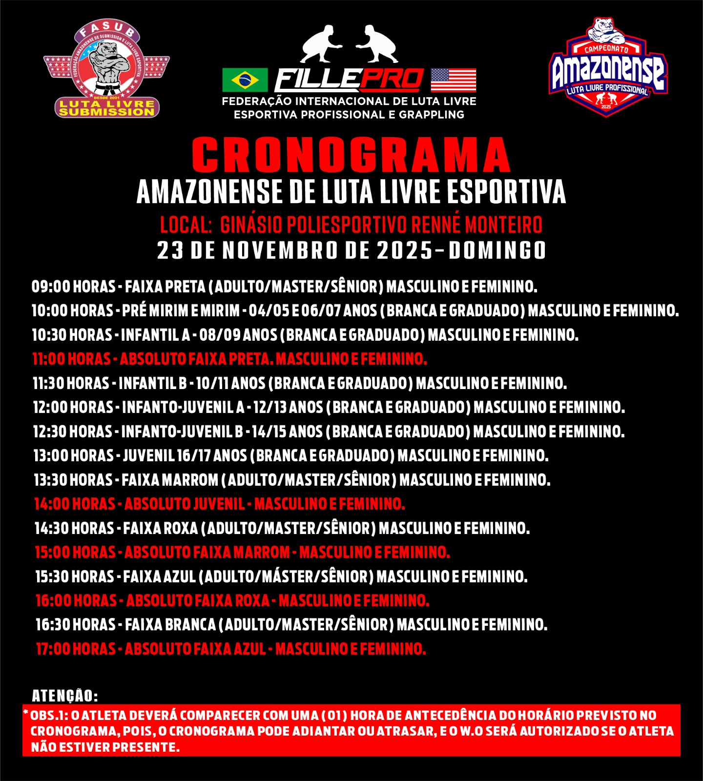 O atleta deve estar no local 1 hora antes da respectiva categoria, seguindo o cronograma de lutas.