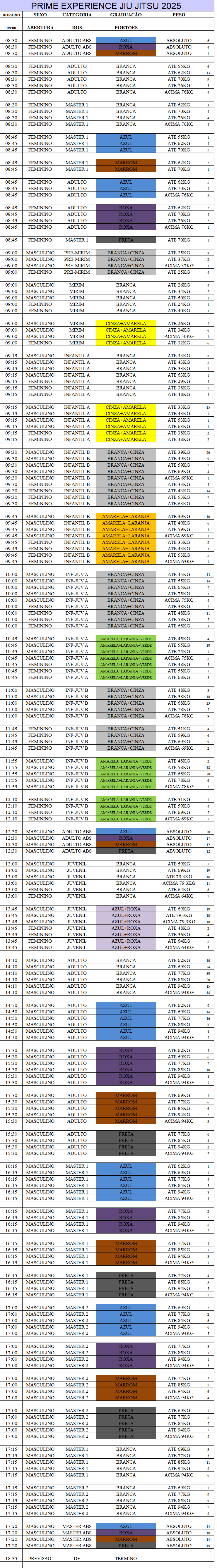 - O horário de abertura NÃO é o horário que o atleta precisa estar no ginásio. Você pode verificar no cronograma e no item REGRAS DE PESAGEM para conferir qual horário precisa estar no evento.