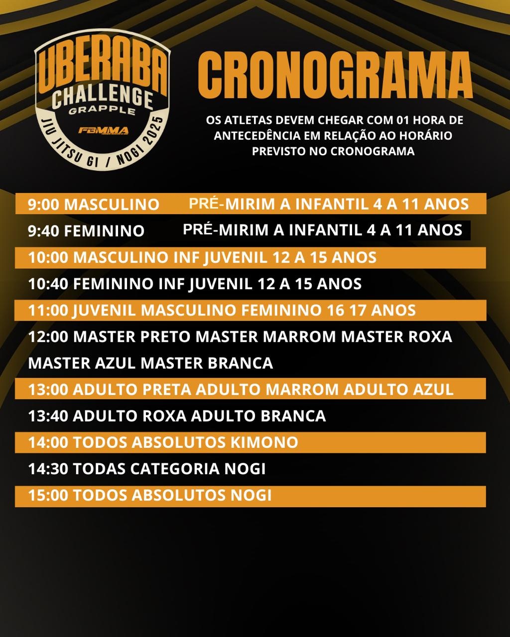 O atleta deve estar no local 1h antes da respectiva categoria, seguindo o cronograma de lutas.