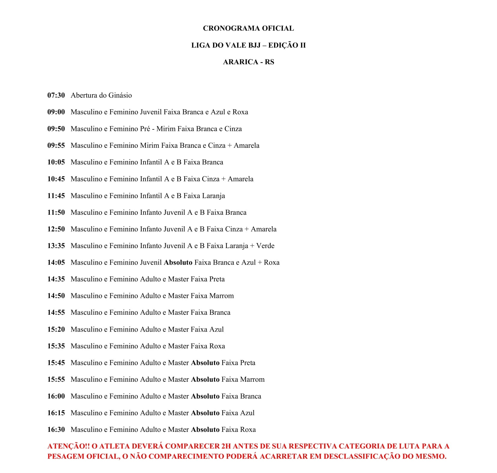 O atleta deve estar no local 1 hora antes da respectiva categoria, seguindo o cronograma de lutas.