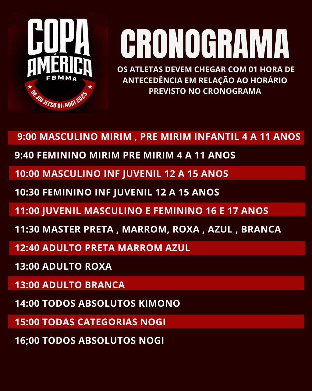 O atleta deve estar no local 1h antes da respectiva categoria, seguindo o cronograma de lutas.