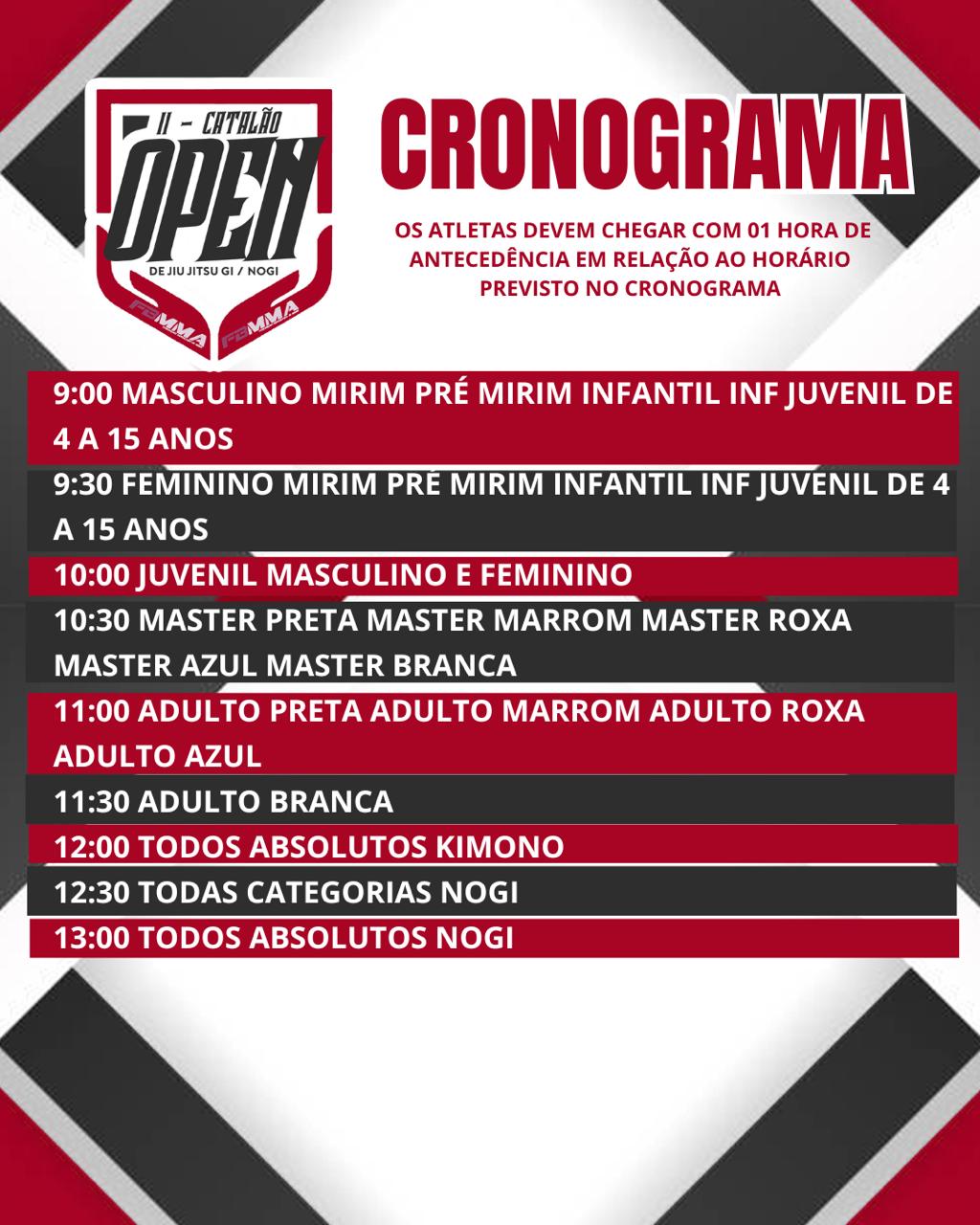 O atleta deve estar no local 1h antes da respectiva categoria, seguindo o cronograma de lutas.
