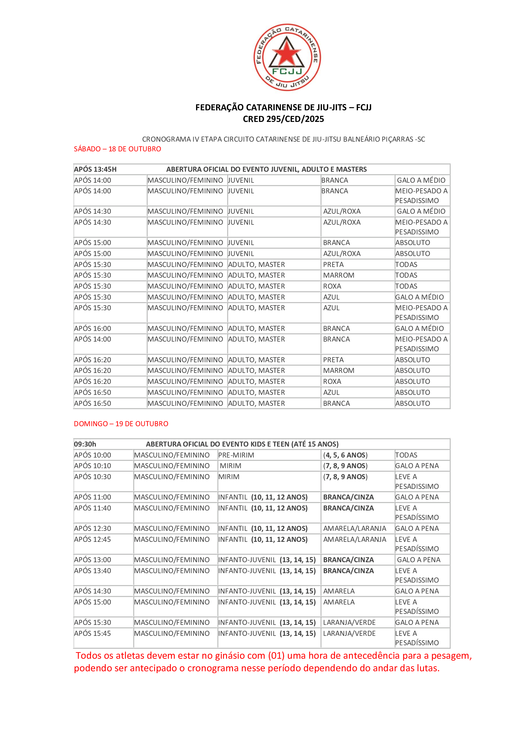 O atleta deve estar no local 1 hora antes da respectiva categoria, seguindo o cronograma de lutas.