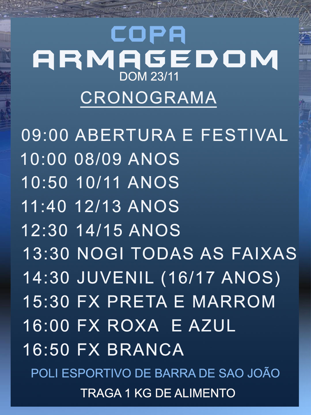 O atleta deve estar no local 1 hora antes da respectiva categoria, seguindo o cronograma de lutas.