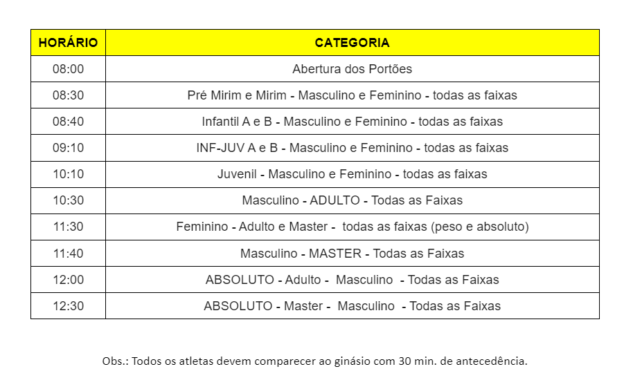 O atleta deve estar no local 1 hora antes da respectiva categoria, seguindo o cronograma de lutas.