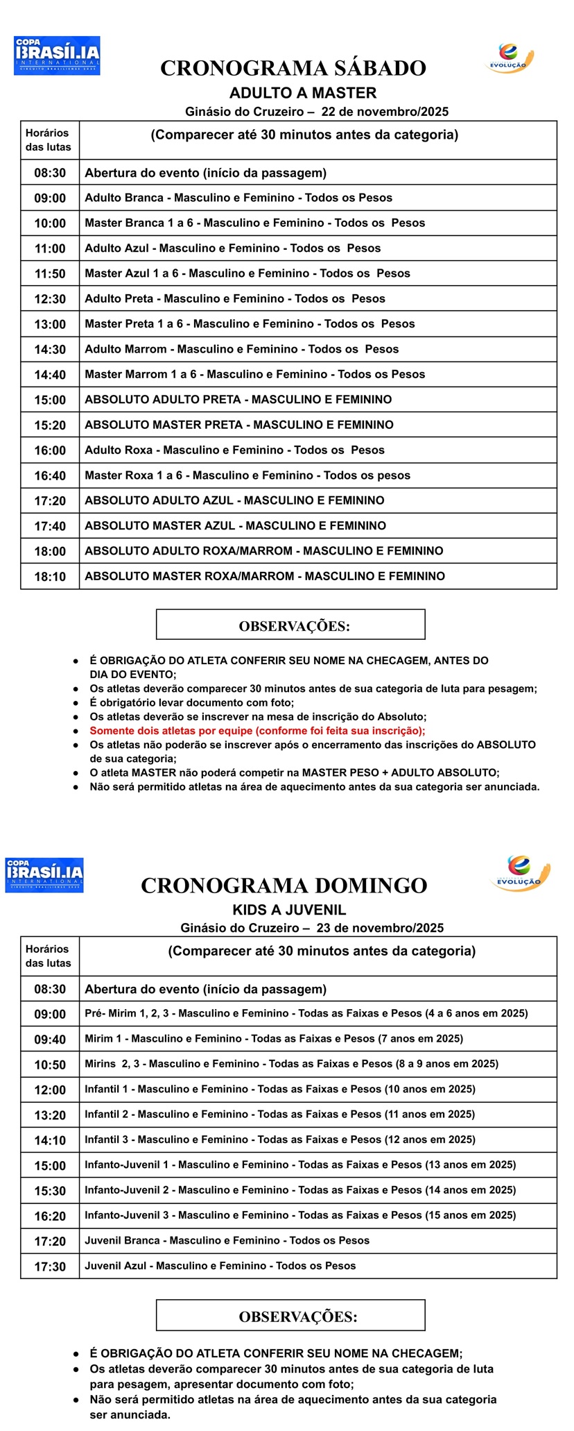 PRÉ-CRONOGRAMA => Previsão das categorias que irá lutar por dia e/ou horário do evento. Observação: Nem todos os eventos possuem pré-cronograma.
