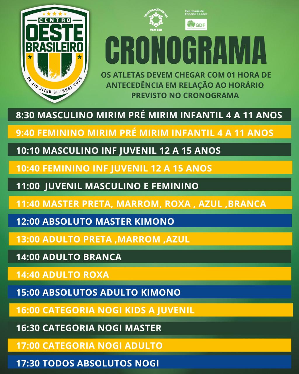 PRÉ-CRONOGRAMA => Previsão das categorias que irá lutar por dia e/ou horário do evento. Observação: Nem todos os eventos possuem pré-cronograma.