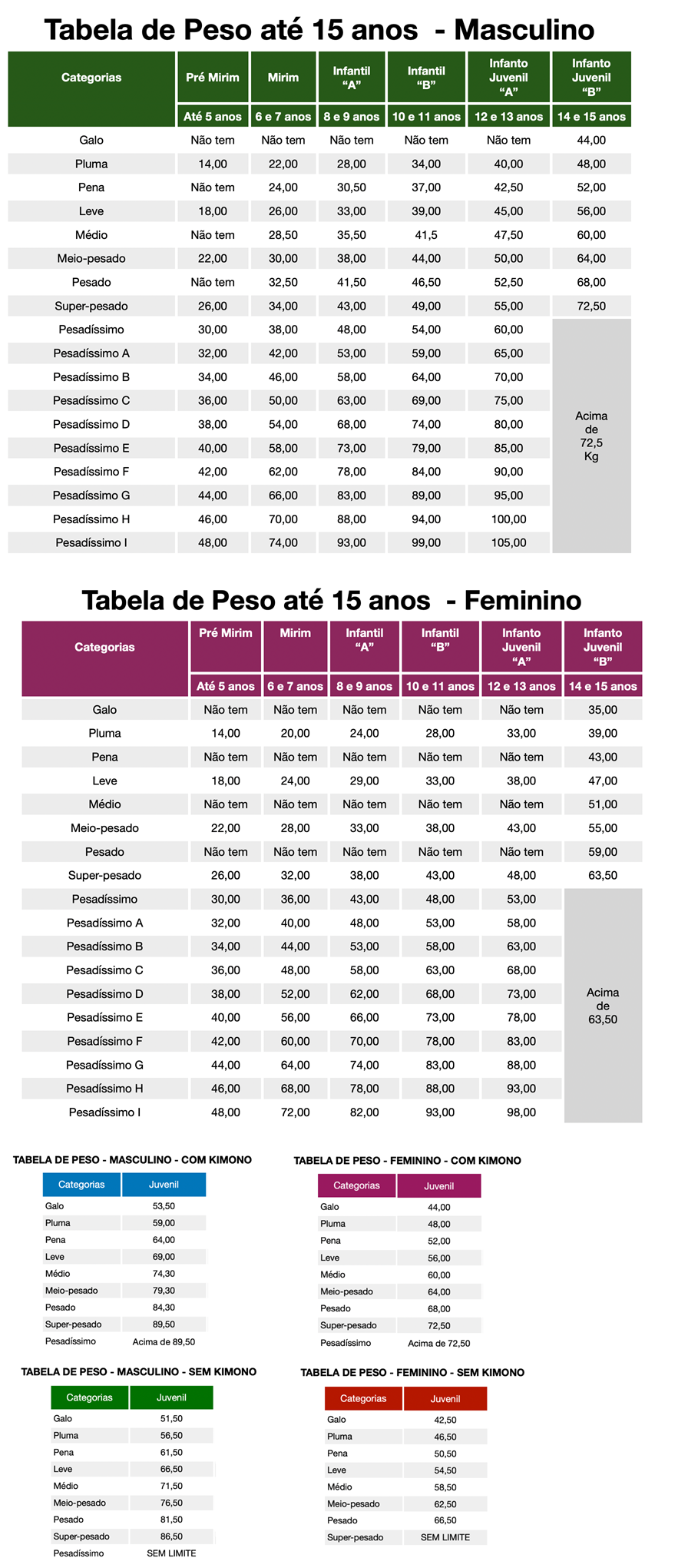 - As categorias ADULTO à MASTER 3 seguem a divisão de peso abaixo: