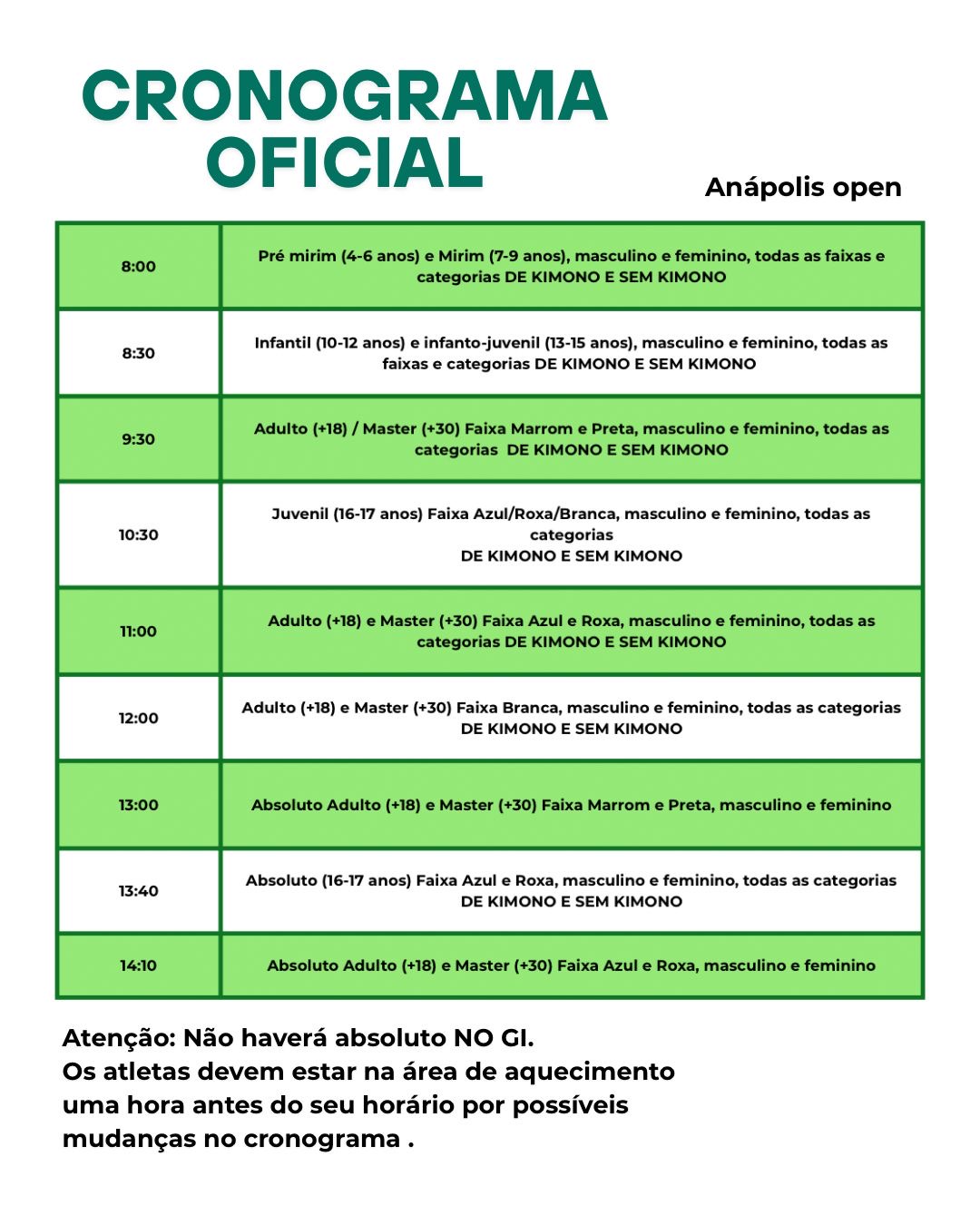 O atleta deve estar no local 1 hora antes da respectiva categoria, seguindo o cronograma de lutas.