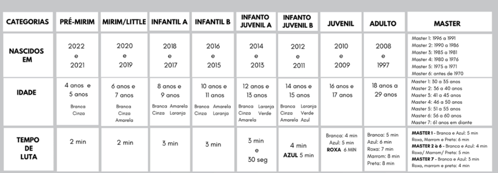 Quando houver agrupamento de faixas, prevalecerá a de MAIOR TEMPO de luta!