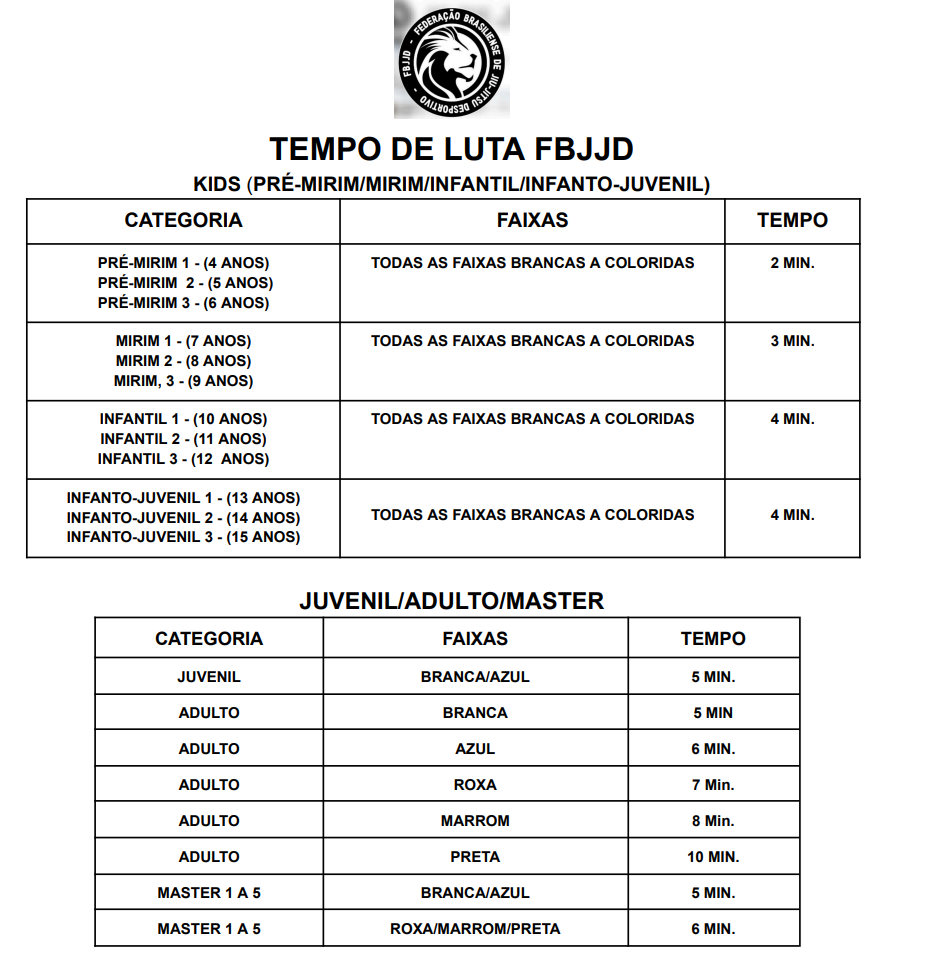 TEMPO DE LUTA => Determinação de tempo máximo para disputa dos atletas por categoria.