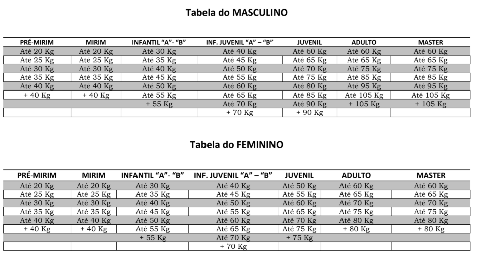 TABELA DE PESO => Informações e regras sobre as categorias e idades disponíveis para inscrição no evento, ou seja, quais os perfis de competidor poderão se inscrever.