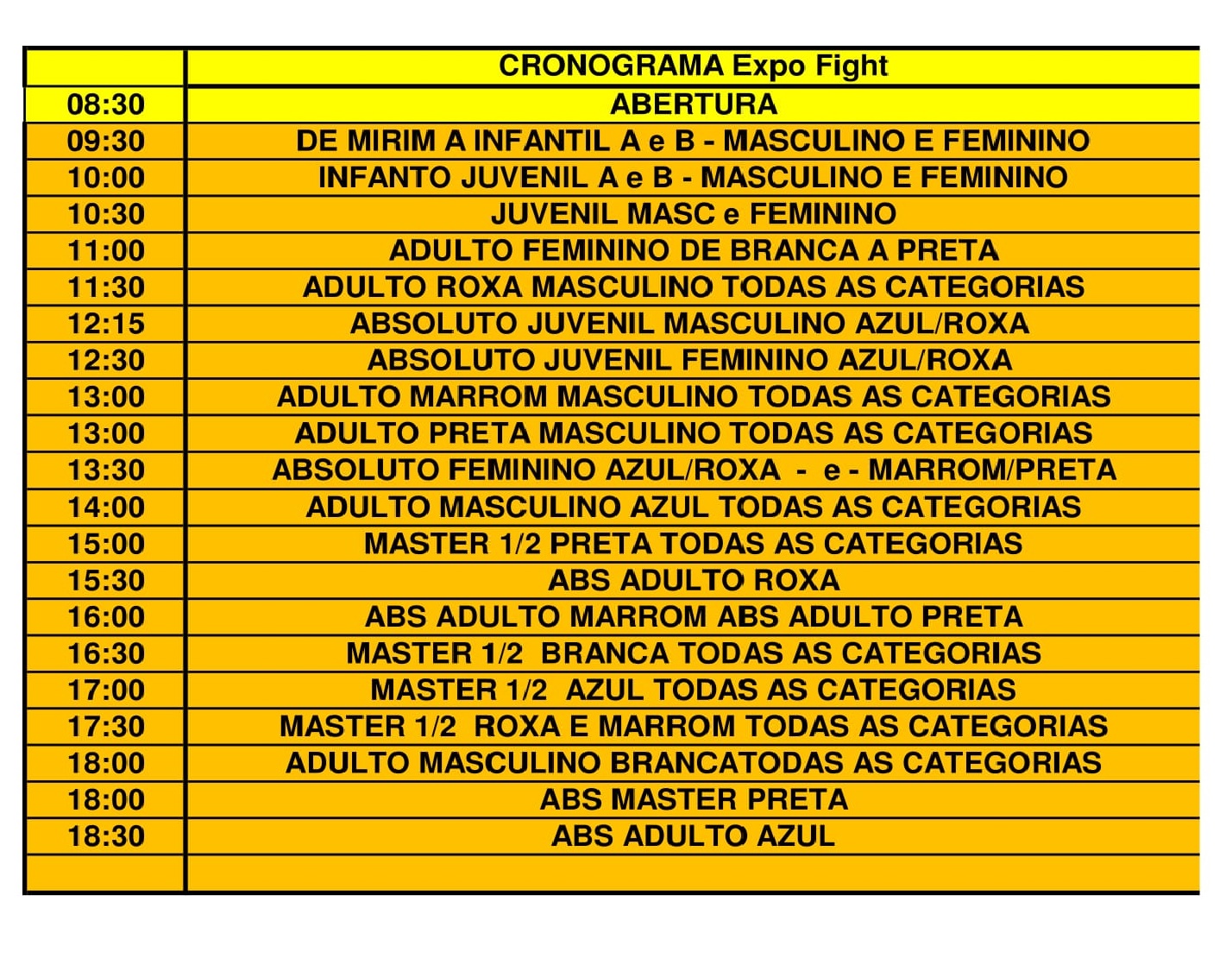 1 hora antes da respectiva categoria, seguindo cronograma de lutas.