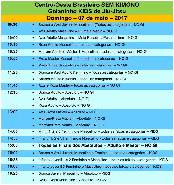 O atleta deve estar no local 1 hora antes da respectiva categoria, seguindo o cronograma de lutas