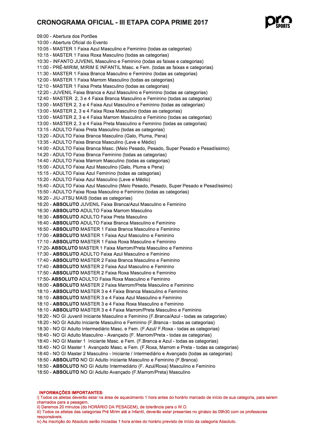 AGRUPAMENTO PRIME: Como forma de possibilitar as lutas entre atletas das categorias KIDS e TEEN ( até 15 anos ) -‐ que devido a grande quantidade de Categorias de Pesos OFICIAIS -‐ CBJJ (Confederação Brasileira de Jiu-‐Jitsu) onde a maioria dos atletas ficavam sozinhos nas Chaves de Lutas das competições Prime em suas categorias oficiais. A Pro Sports estará agrupando e pré-‐estabelecendo categorias específicas para as competições da Copa Prime. Conforme tabela de agrupamento disponível em site oficial (www.prosportsbjj.com). Desta forma, os casamentos de lutas só acontecerão entre as categorias de pesos dos agrupamentos de categorias de faixas e idades pré-‐estabelecidos para as competições Prime.
