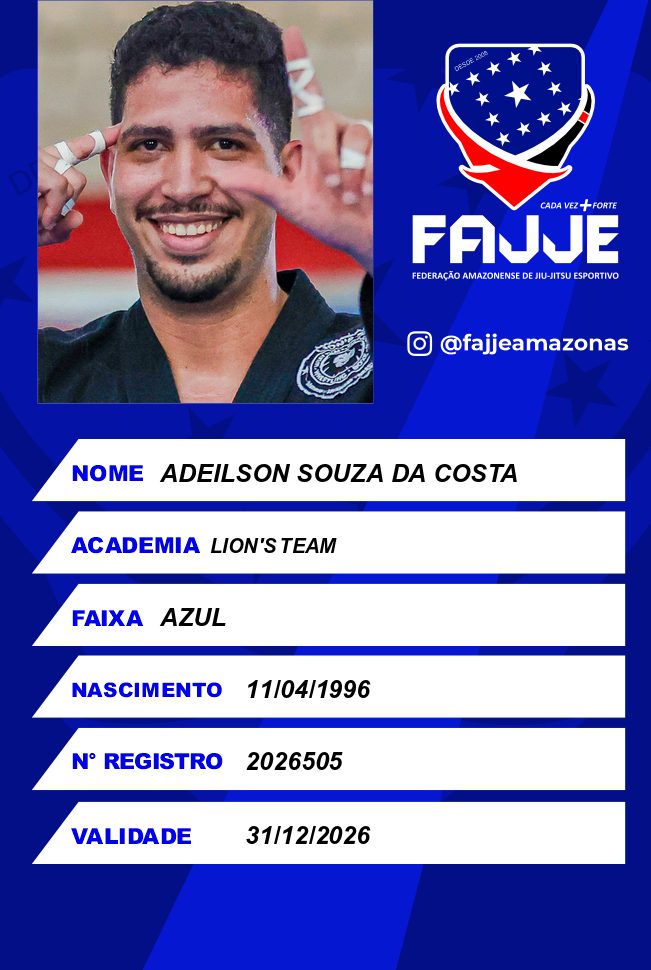 | 21/02/2026 | P2587-AMAZON OPEN GI E NOGI DE JIU JITSU ESPORTIVO FAJJE 2026 - EDICAO | BRASIL | MANAUS - AM | 2º | MASCULINO/MASTER 1/AZUL/MEIO-PESADO |