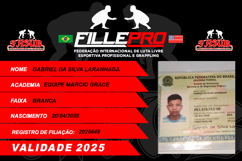 | 09/03/2025 | P2253-PAN AMERICANO DE LUTA LIVRE ESPORTIVA 2025 - EDICAO | BRASIL | MANAUS - AM | 1º | MASCULINO/JUVENIL/BRANCA/PENA |