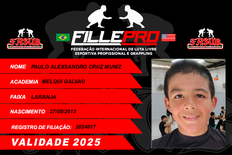 | 09/03/2025 | P2253-PAN AMERICANO DE LUTA LIVRE ESPORTIVA 2025 - EDICAO | BRASIL | MANAUS - AM | 1º | MASCULINO/INFANTO-JUVENIL A/LARANJA/LEVE | |