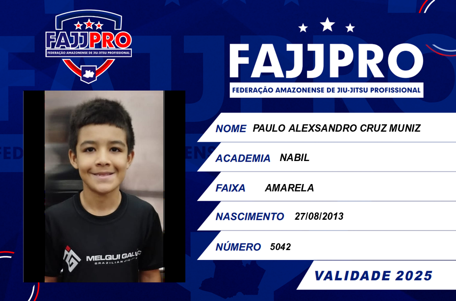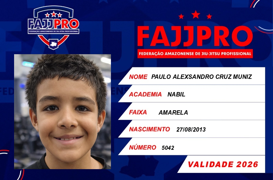 | 11/10/2025 | P2483-COPA JUVENTUDE E AMAZONENSE NOGI FAJJPRO 2025 - EDICAO | BRASIL | MANAUS - AM | 2º | MASCULINO/INF-JUV A NOGI ABS/BRANCA A VERDE/ABSOLUTO LEVE | |