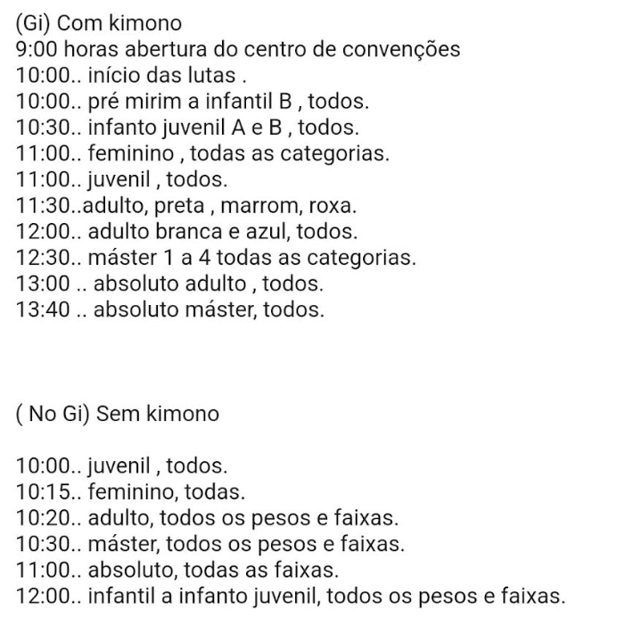 O atleta deve estar no local 1 hora antes da respectiva categoria, seguindo o cronograma de lutas.