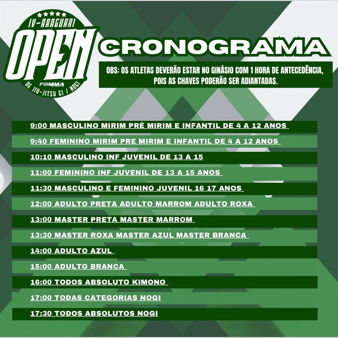 O atleta deve estar no local 1h antes da respectiva categoria, seguindo o cronograma de lutas.
