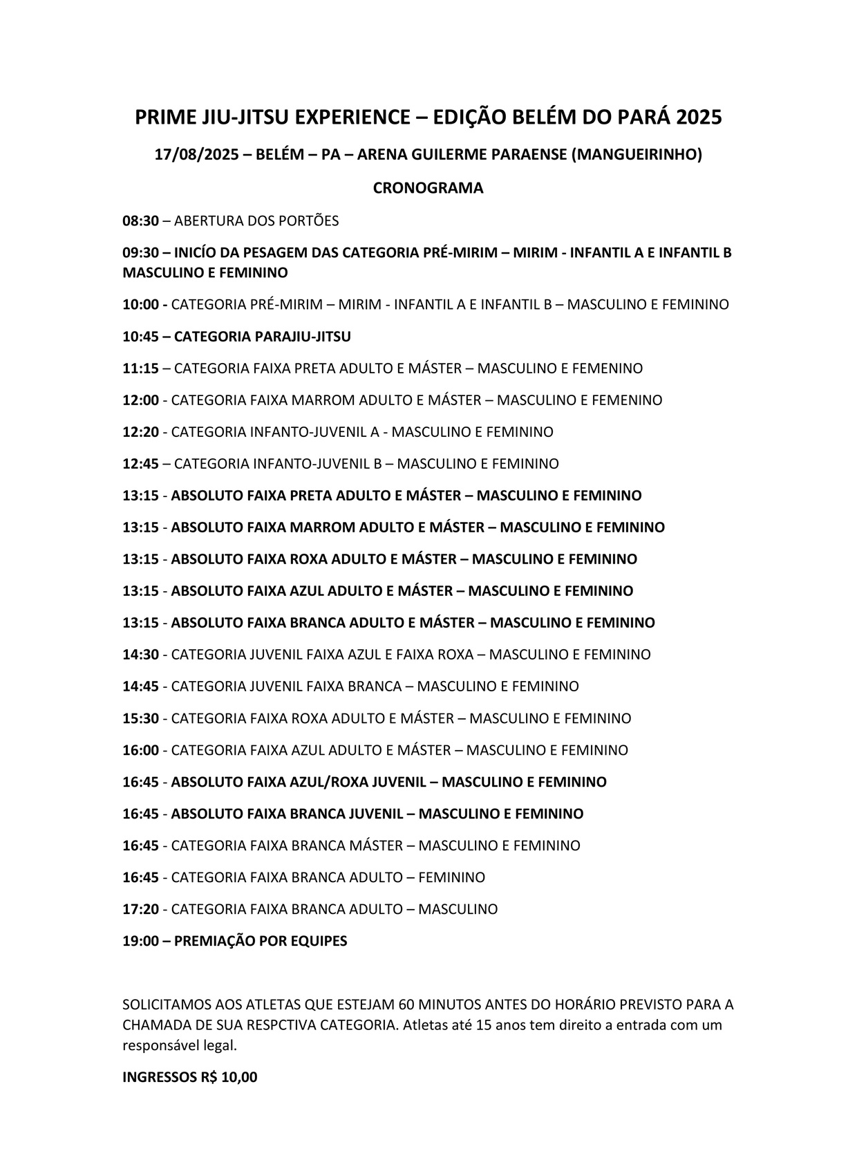 O atleta deve estar no local 1 hora antes da respectiva categoria, seguindo o cronograma de lutas.