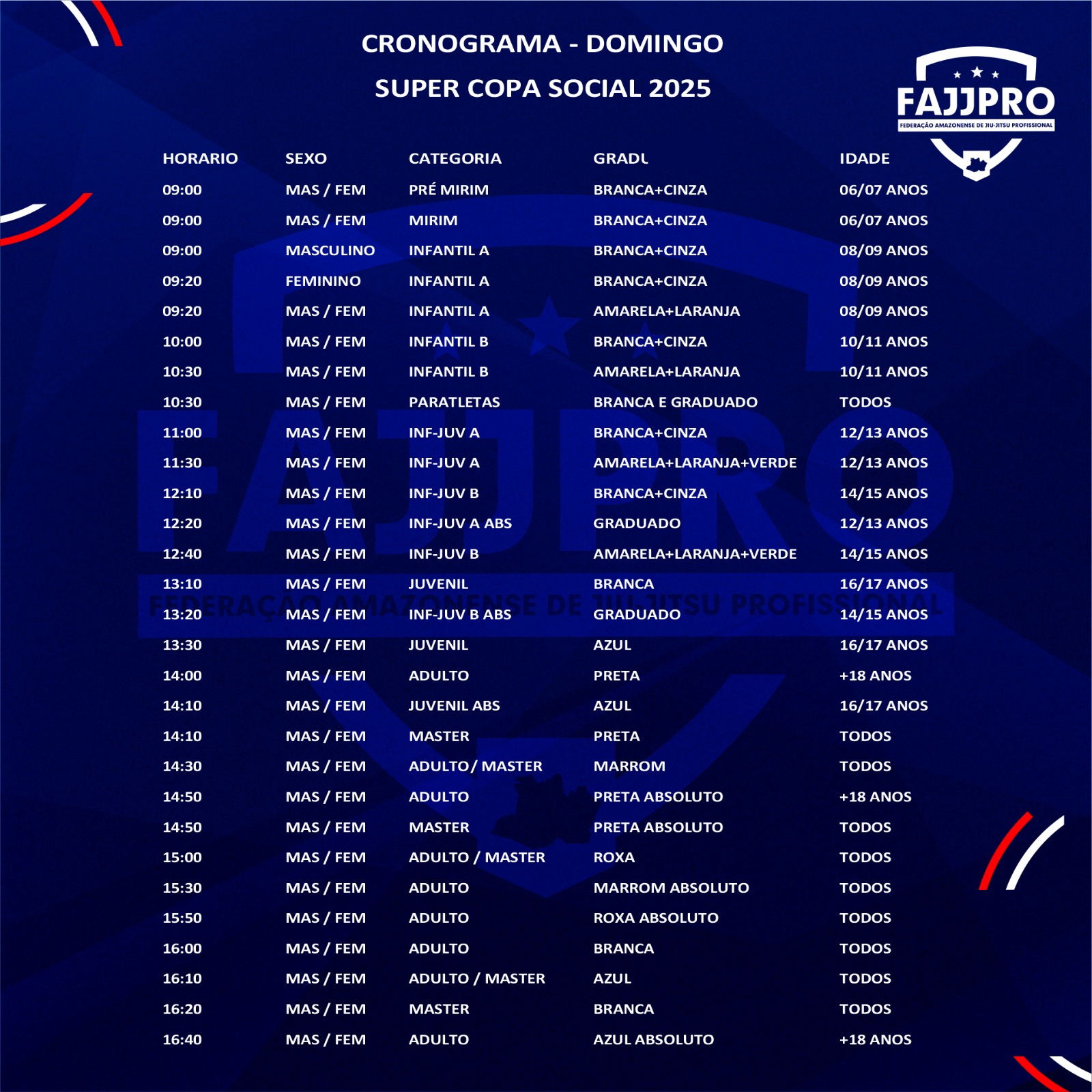 O atleta deve estar no local 1 hora antes da respectiva categoria, seguindo o cronograma de lutas.