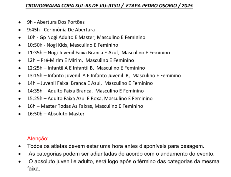 O atleta deve estar no local 1 hora antes da respectiva categoria, seguindo o cronograma de lutas.