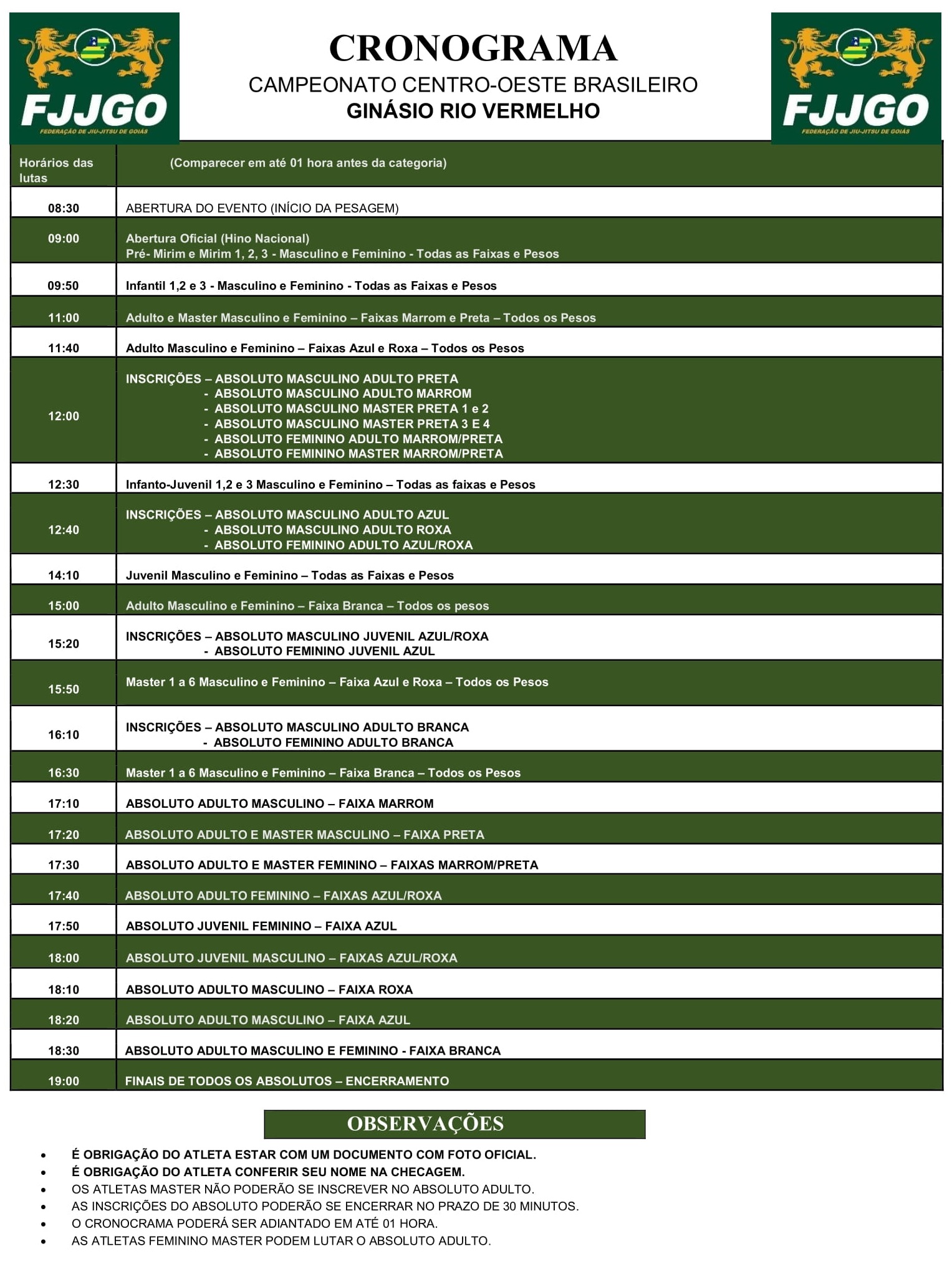 O atleta deve estar no local 1 hora antes da respectiva categoria, seguindo o cronograma de lutas.