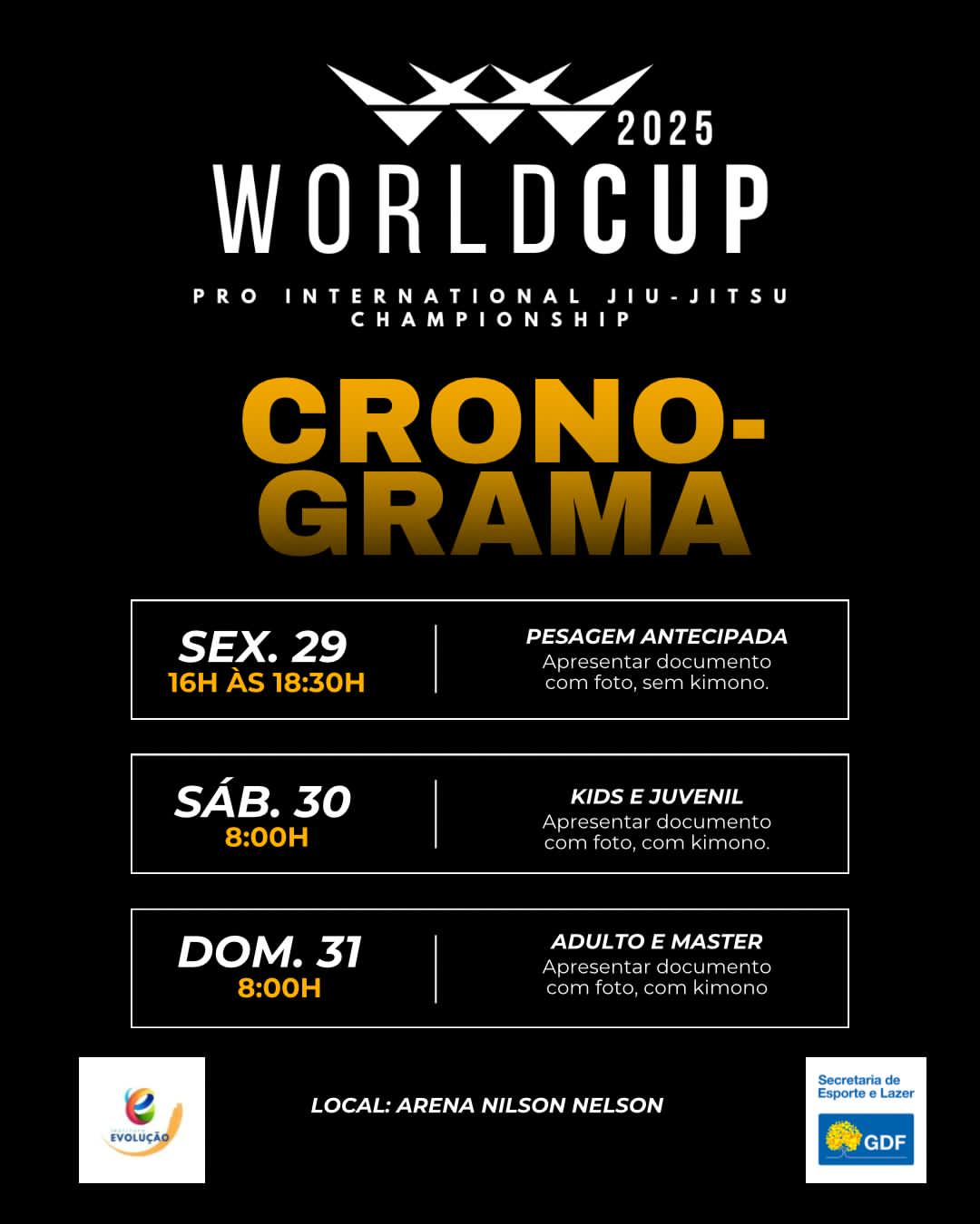 PESAGEM ANTECIPADA: Sexta-feira - das 16h às 18h30 - Arena Nilson Nelson - A pesagem ANTECIPADA poderá ser feita sem kimono.
