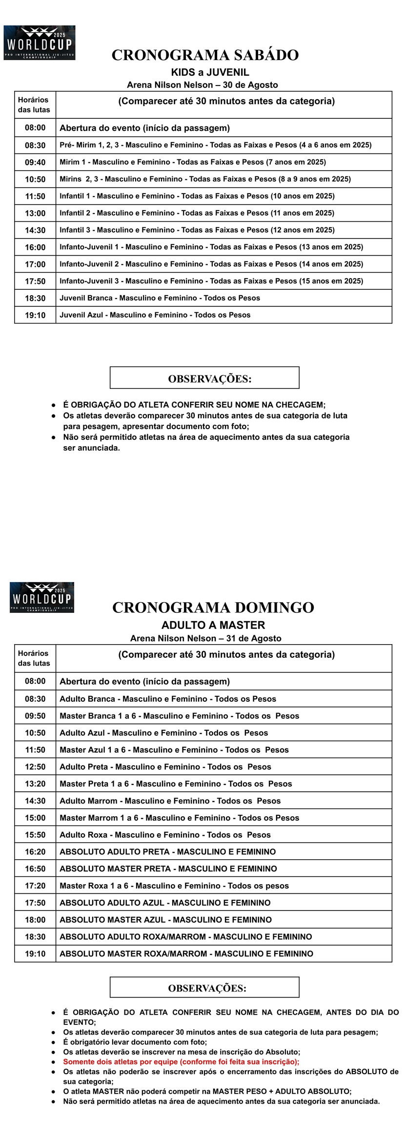 NOS DIAS DO EVENTO: O atleta deverá estar no local 1h antes do previsto da categoria, para pesagem, pesagem somente COM KIMONO.