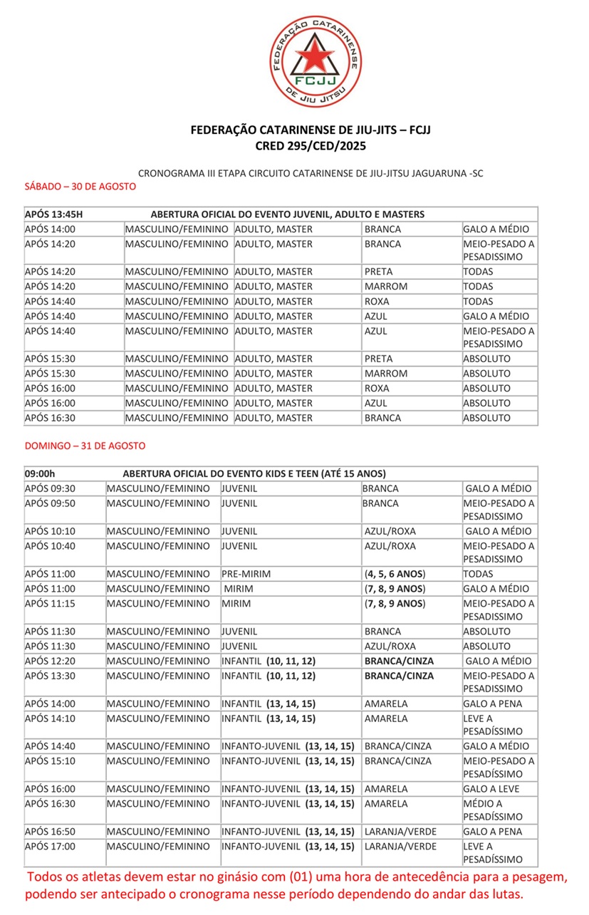 O atleta deve estar no local 1 hora antes da respectiva categoria, seguindo o cronograma de lutas.