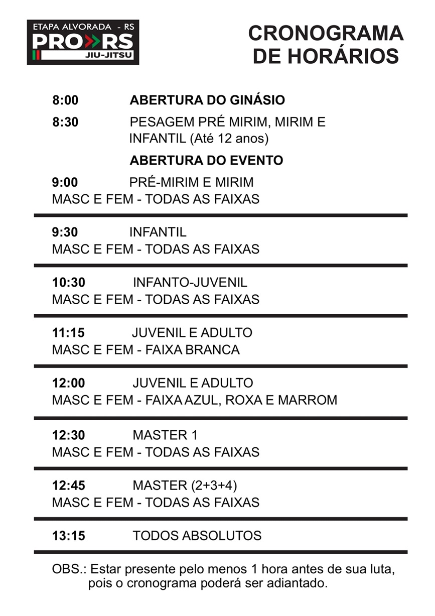 O atleta deve estar no local 1h antes do cronograma, pois o mesmo poderá ser adiantado.