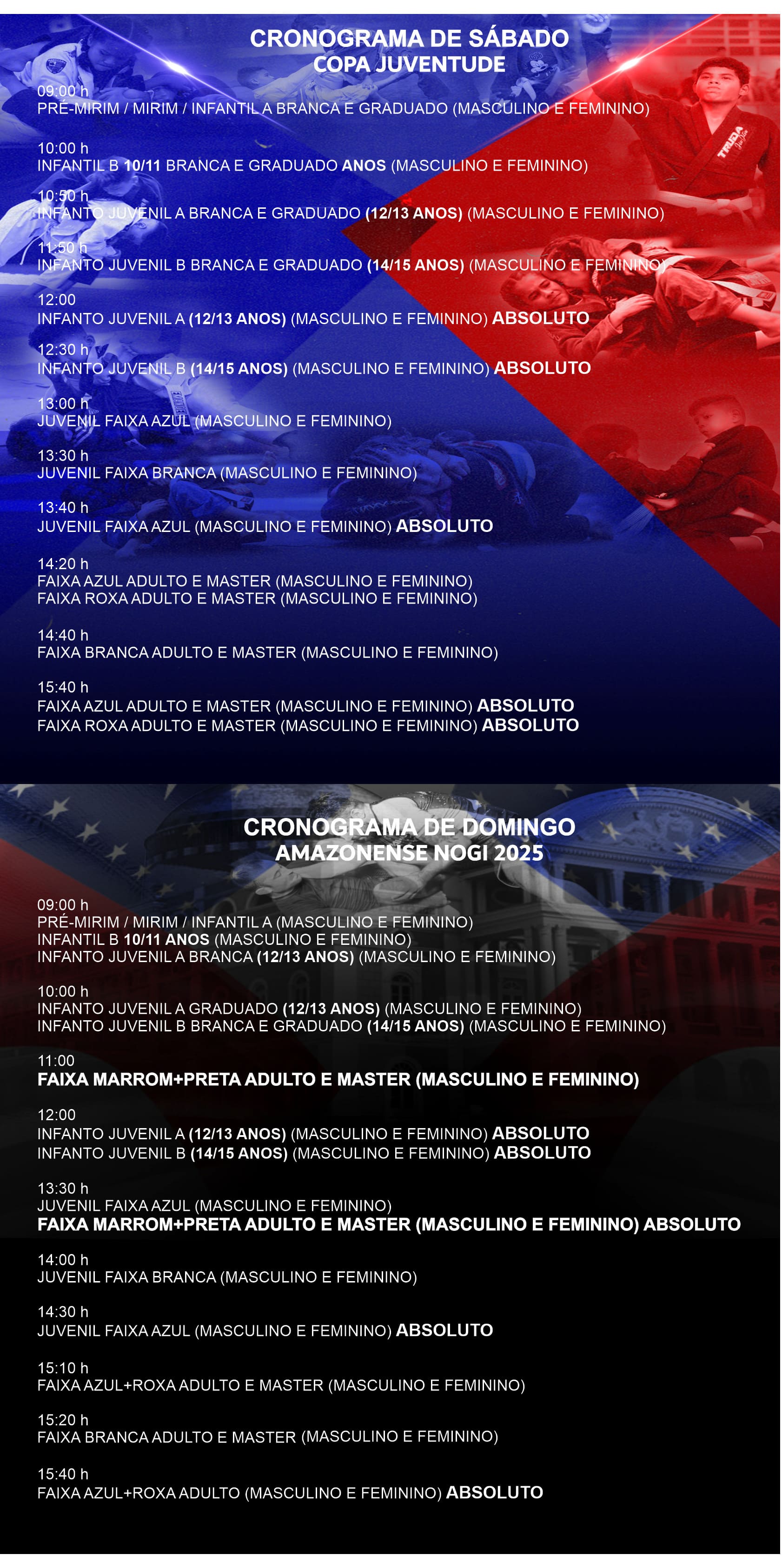 COPA JUVENTUDE E AMAZONENSE NOGI 2025 – EVENTO VALENDO PONTO PARA O RANKING DA FAJJPRO, VOLTADO A TODOS OS ATLETAS PRATICANTES DE JIU-JITSU, NOGI OU SUBMISSION, COM PREMIAÇÃO EM DINHEIRO PARA OS ABSOLUTOS.