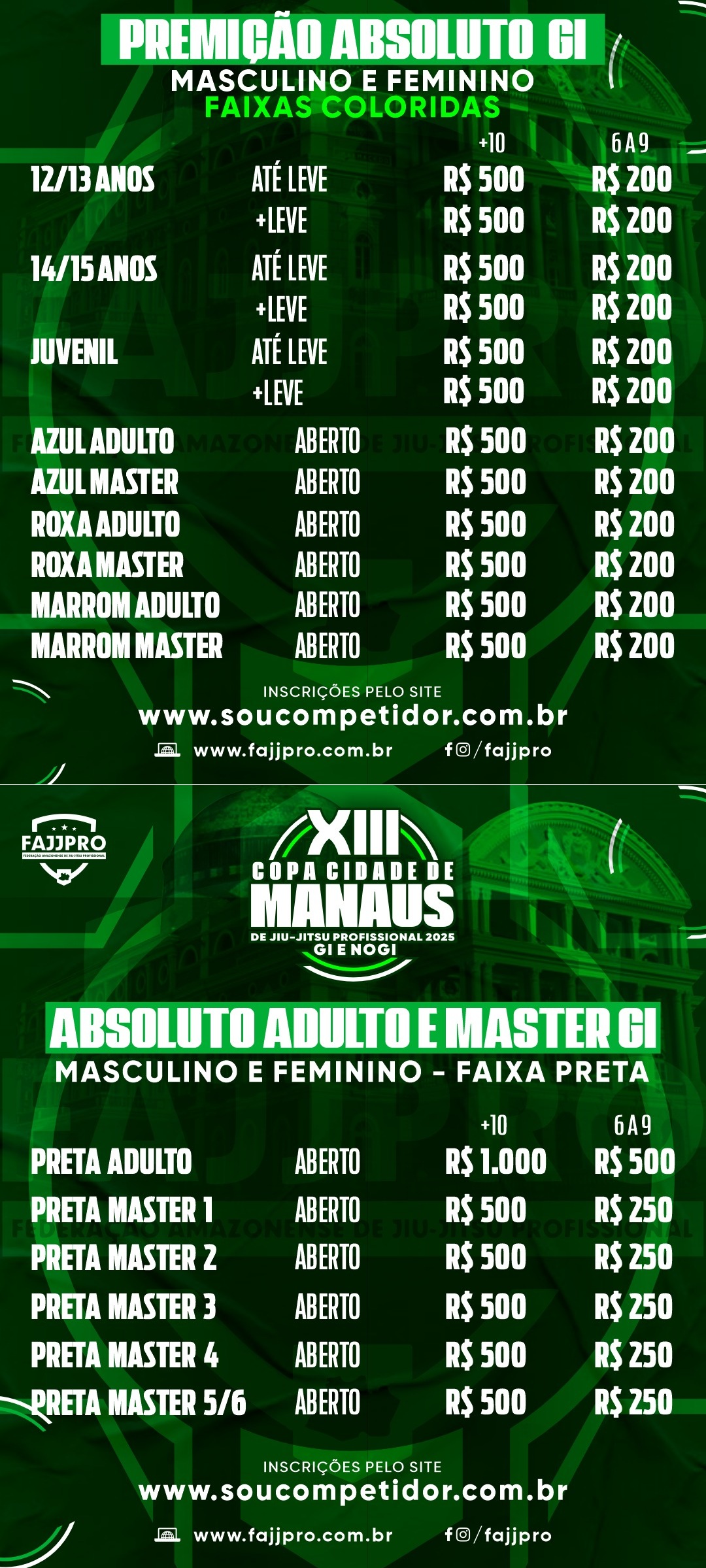 XIII COPA CIDADE DE MANAUS, ULTIMO EVENTO DO CALENDARIO ANUAL DA FAJJPRO, VALENDO PONTO PARA O RANKING DAS ACADEMIAS, VOLTADO PARA TODOS OS ATLETAS, INICIANTES, AMADORES E PROFISSIONAIS DE JIU-JITSU, COM PREMIAÇÃO EM DINHEIRO PARA AS EQUIPES E ABSOLUTOS.