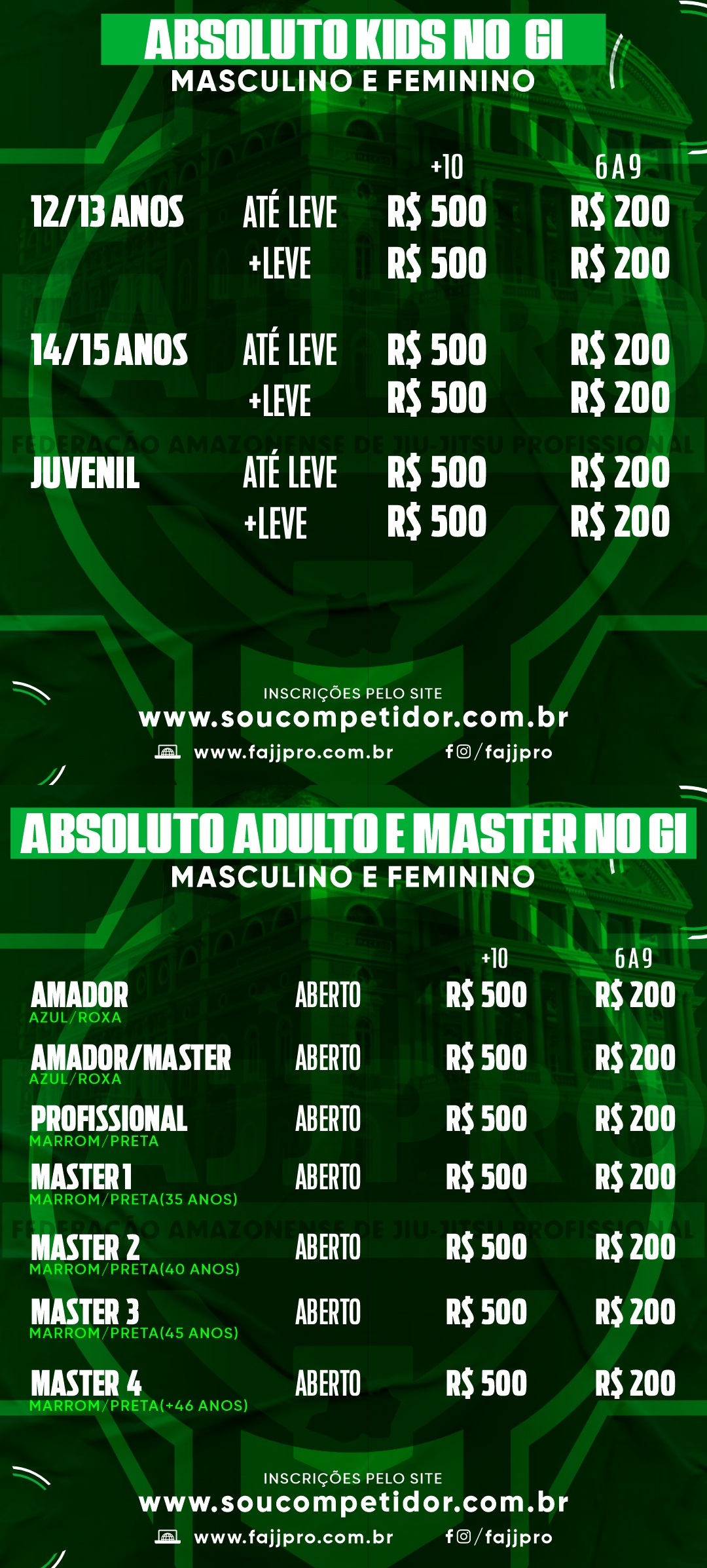 O atleta MASTER, poderá se inscrever na MASTER PESO + ADULTO ABSOLUTO, se desejar.