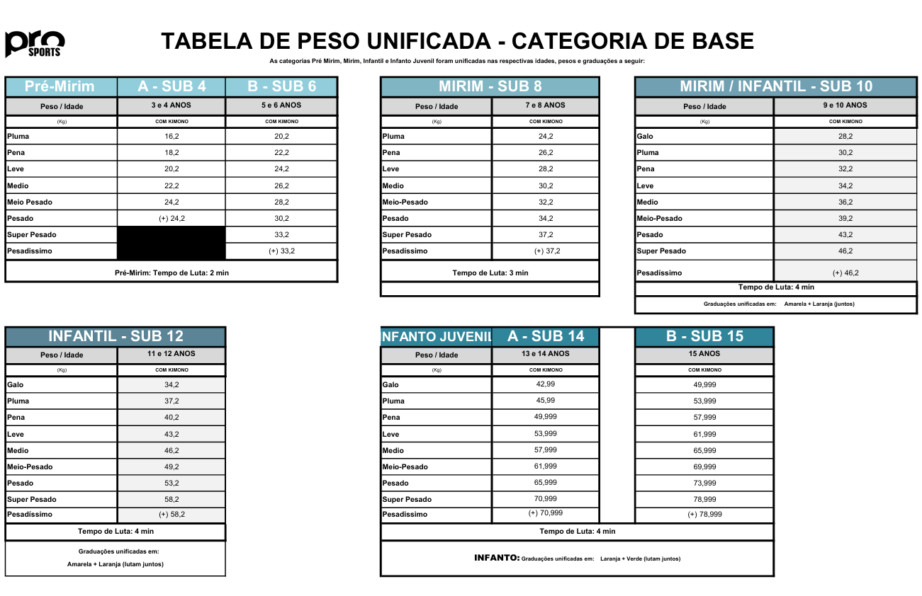 As categorias Pré Mirim, Mirim e Infantil foram unificadas conforme tabela a seguir: