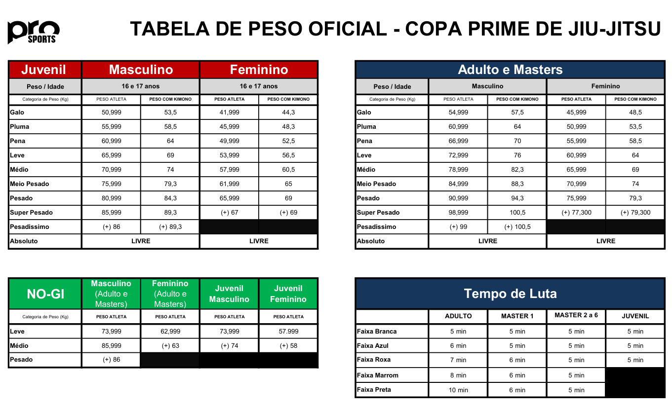 Para as lutas com Kimono a tabela de peso obedecerá a tabela oficial da CBJJ