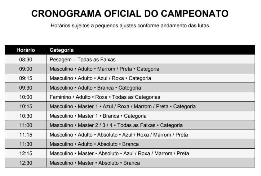O atleta deve estar no local 1h antes da respectiva categoria, seguindo o cronograma de lutas.