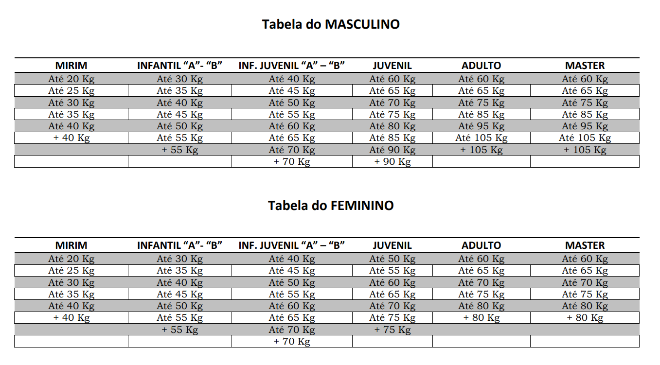 TABELA DE PESO => Informações e regras sobre as categorias e idades disponíveis para inscrição no evento, ou seja, quais os perfis de competidor poderão se inscrever.