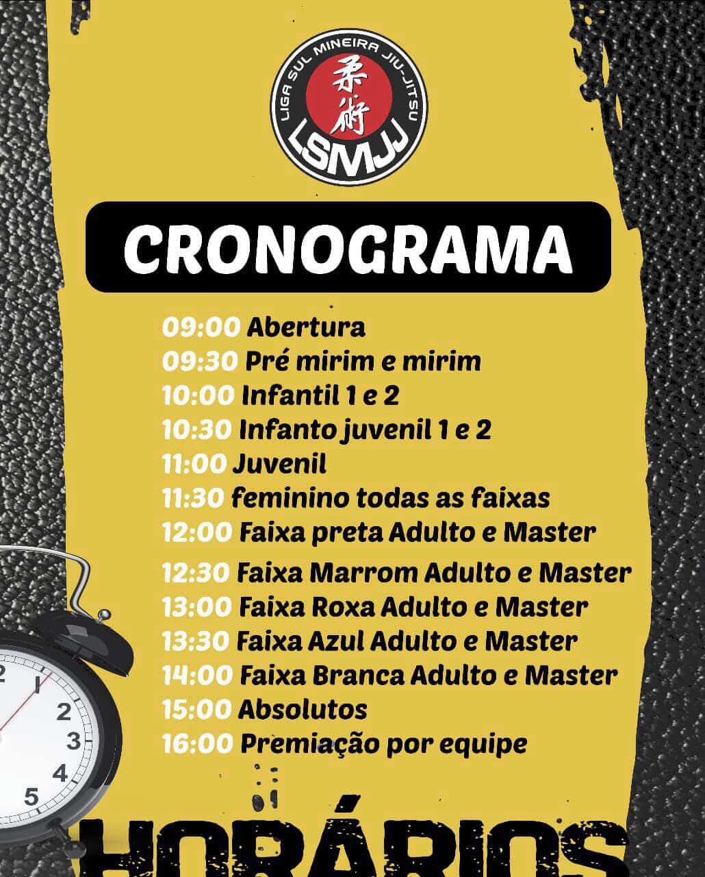 O atleta deve estar no local 1h antes da respectiva categoria, seguindo o cronograma de lutas.