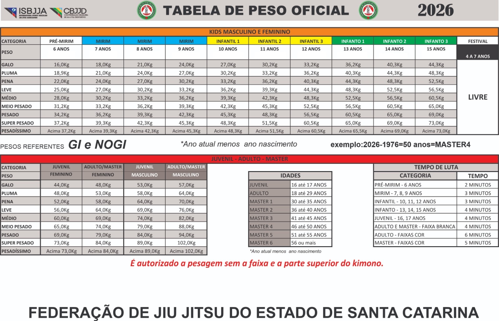 A tabela mostra os pesos separadamente, mas este evento agrupa de 2 em 2 anos, seguindo as divisões abaixo, com a referência de peso da maior idade: