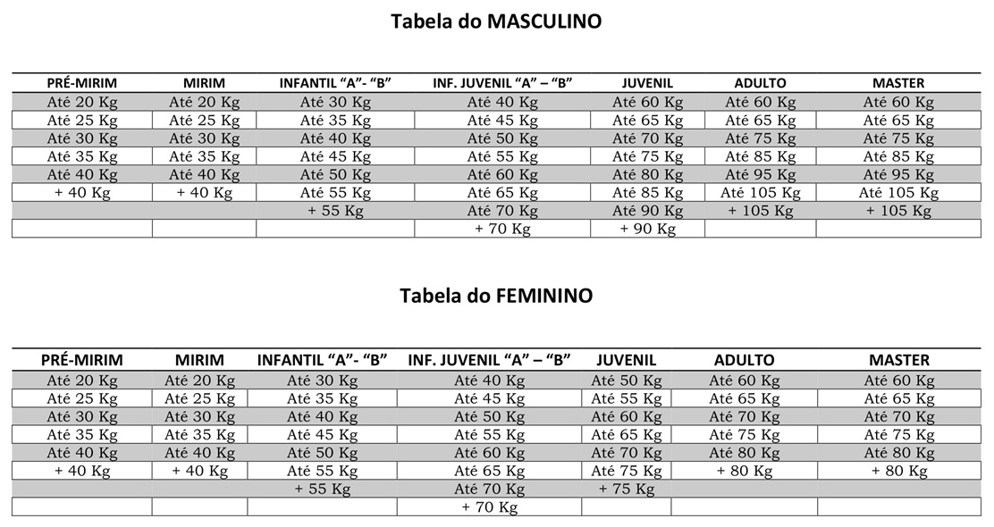 TABELA DE PESO => Informações e regras sobre as categorias e idades disponíveis para inscrição no evento, ou seja, quais os perfis de competidor poderão se inscrever.